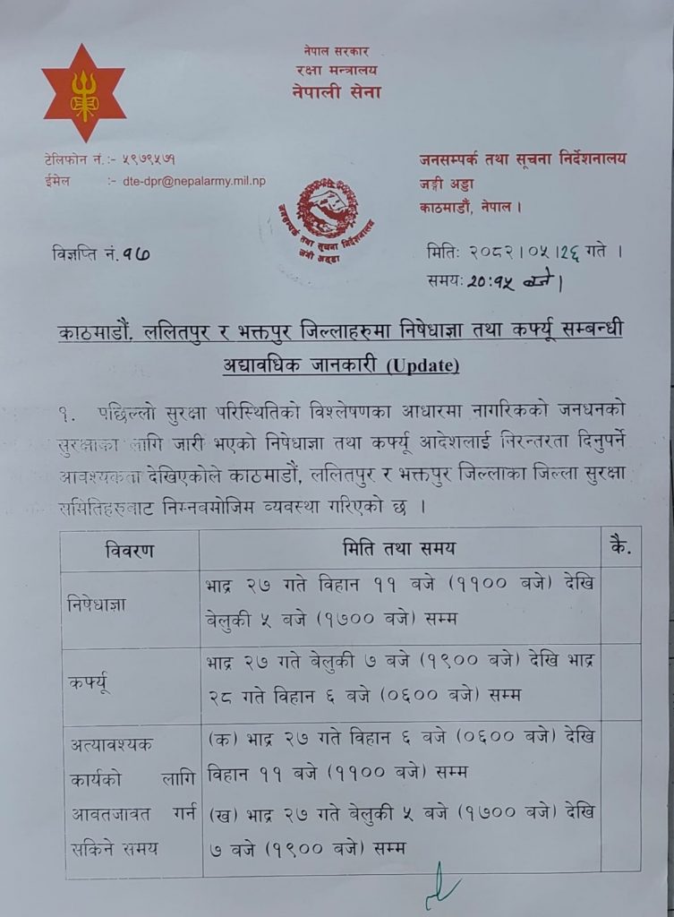 जारी विज्ञप्तिमा भदौ २७ गते बिहान ११ बजेदेखि बेलुकी ५ बजेसम्म निषेधाज्ञा र भदौ २७ गते बेलुकी ७ बजेदेखि भदौ २८ गते बिहान ६ बजेसम्म कर्फ्युलाई निरन्तरता दिइएको उल्लेख छ ।
