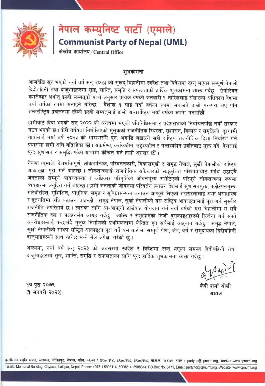 नयाँ वर्ष सन् २०२३ को उपलक्ष्यमा आज यहाँ जारी शुभकामना सन्देशमा उनले नयाँ वर्षको आगमनसँगै मुलुक राष्ट्रिय राजनीतिक दिशा निर्धारण गर्ने प्रयासमा अघि बढेको बताएका हुन्। उनले सन्देशमा भनेका छन्, ‘एमाले देशभक्तिपूर्ण, लोकतान्त्रिक, परिवर्तनकारी, विकासमुखी र समृद्ध नेपाल, सुखी नेपालीको राष्ट्रिय आकाङ्शालाई पूरा गर्न चाहन्छ।’